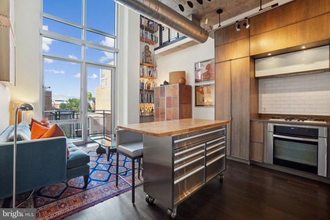 - Exposed ceilings and ductwork float above gleaming hardwood floors